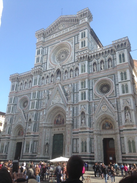 その日は朝からまず花の聖母教会へ。赤くて巨大なキューポラ(丸屋根)が有名なこの教会はフィレンツェ象徴でもあります。ドゥオーモ前の広場は平日なので人はそれほど多くありませんが、やはりここにもいました、ジプシー。典型的な民族衣装っぽい身なりの老女が近づいてきては、こちらに向かって十字を切ってお祈りし、なにかめぐんでくれるよう、しきりに言っています(たぶん)。かなりしつこく周りをぐるぐる回っていますが、無視し続けるとあきらめて別の観光客目指して行ってしまいました。