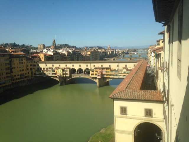 回廊を周る途中に窓から見える景色。正面の屋根のある橋はベッキオ橋(映画「香水」でもでてきましたね)