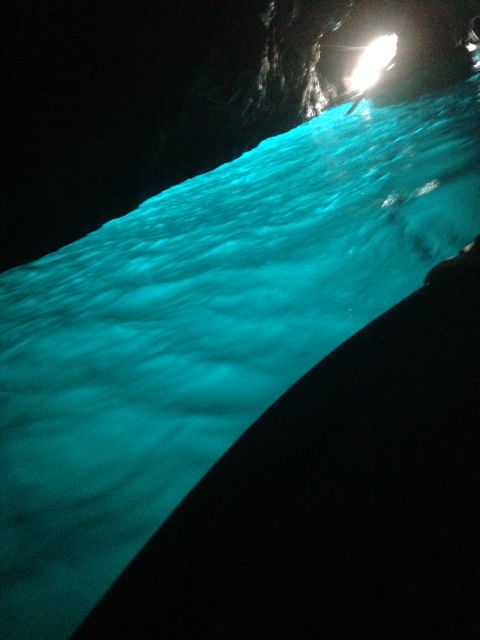 洞窟の中は真っ暗です。その時、船頭さんが「後、ウシロミテー!」と叫びました。頭を上げて振り返ると・・・波間が青く、青く光っています!テレビや雑誌で何度も見たあの青。いや、それよりももっと青い。雨が上がったばかりで、それほど外の光も強くないはずなのに、それはまるで海中から強いライトで照らしているのではといぶかしむほど、明るい青さでした。