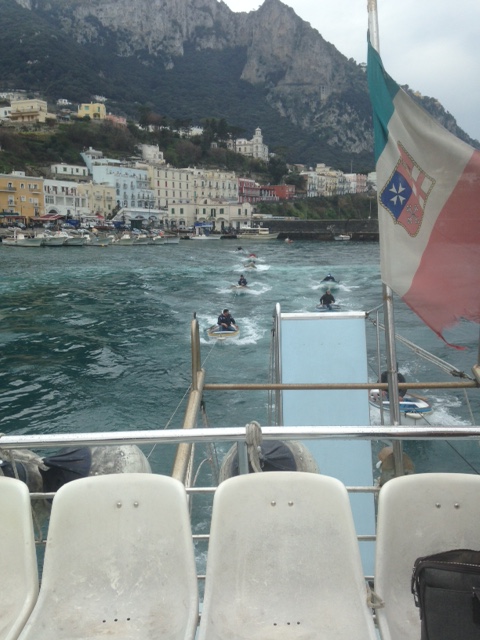 高速船は港を離れ、窓の外の雨にけぶるヴェスヴィオ山をぼんやりと眺めながら、「ああ、この天気では青の洞窟は無理かも・・・」などと考えていました。ふと気づくと、時間が経っても一向に景色が変らないような気がして、船は確かに進んでいるはずなのに変だと思っていた矢先、イタリア語で放送があり、どうやらエンジンのトラブルでナポリの港に引き返すような様子です。我々の不安げな様子を感じたのか、近くの席に座っていたイケメンの男性が、英語で説明してくれました。ちょっぴり嬉しかったです。